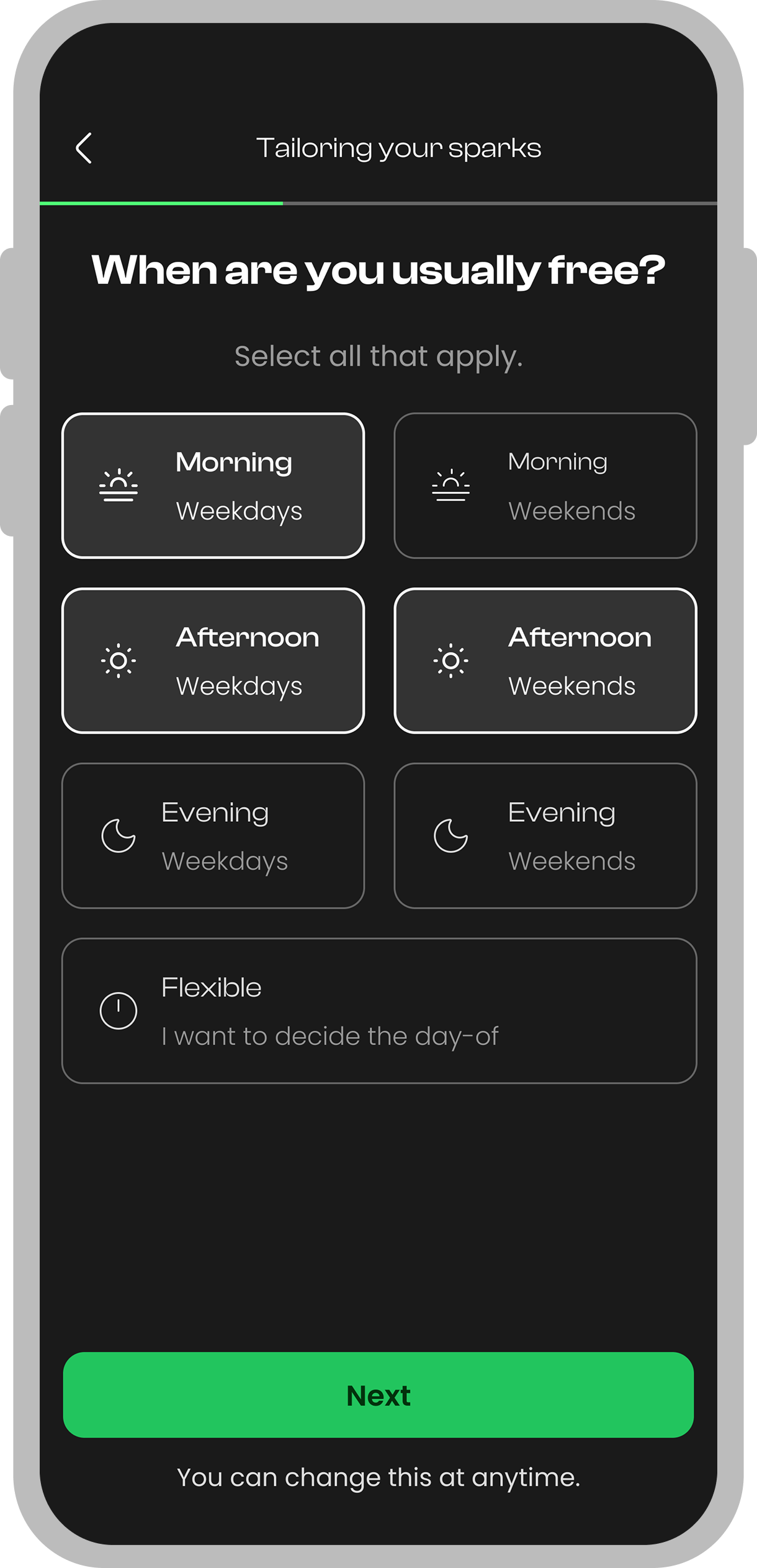 - The "Spark" flow is quick and casual: suggest an idea in just a few taps.